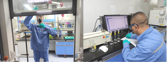 比賽于9月12日正式拉開(kāi)帷幕。賽前,大家仔細(xì)檢查硫分析儀的運(yùn)行狀態(tài)、核對(duì)標(biāo)準(zhǔn)溶液的有效期,不放過(guò)任何細(xì)節(jié);“計(jì)時(shí)開(kāi)始”的指令下達(dá)后,全場(chǎng)瞬間進(jìn)入“靜音競(jìng)技模式”。選手們屏氣凝神,手持移液管精準(zhǔn)取液,目光緊盯刻度線(xiàn)確保無(wú)一滴偏差;在容量瓶定容時(shí),小心翼翼控制滴管滴速,反復(fù)確認(rèn)凹液面與刻度線(xiàn)齊平。整個(gè)過(guò)程緊湊流暢,選手們動(dòng)作嫻熟卻不倉(cāng)促,每一次操作后的復(fù)核,都彰顯著宇新化驗(yàn)人對(duì)“數(shù)據(jù)精準(zhǔn)”的執(zhí)著追求。