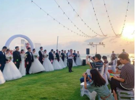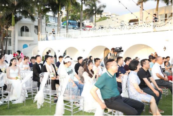 下午15點,新人們完成妝造發(fā)型,來到婚禮現(xiàn)場。新郎們統(tǒng)一著筆挺西裝,紳士裝扮帥氣極了。新娘們將及腰長發(fā)挽起,戴上珍珠鉆石點綴的皇冠,薄紗披在萬千青絲上?;榧喌目钍礁鞑幌嗤?,有胸前鑲嵌鉆石,后背鏤空設計的魚尾婚紗,完美地展示身材曲線;也有綢緞面料寬大裙擺的一字肩婚紗,搭配著小禮帽頭紗,充滿了法式風情;更多的是蓬蓬型婚紗,上身裁剪合體收腰,下身蓬起的寬大蕾絲裙擺,層層疊疊輕紗彌漫,或綴滿軟緞織就的玫瑰,或寶石拼鑲閃閃發(fā)光,讓新娘如同高貴的公主,優(yōu)雅而華麗。