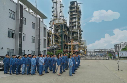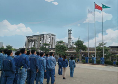 9點(diǎn)55分,全體出席升旗儀式的員工在宇新化工辦公樓前坪列隊(duì)集合,抬頭挺胸,等待著國歌的響起、五星紅旗的飛揚(yáng)。10點(diǎn)整,旗手們著裝整齊,邁著鏗鏘有力的步伐,護(hù)著鮮艷的五星紅旗入場。伴著雄壯的《義勇軍進(jìn)行曲》響起,國旗冉冉升起,全體員工行注目禮,莊嚴(yán)肅穆。