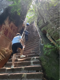 另一組步行登山的黨員同志們,則充分展現(xiàn)了“不怕苦、不怕累”的黨員精神。烈日當頭,山路崎嶇,途中的“通天峽”更是陡峭,石階幾乎呈90°蜿蜒而上,居高而望,令人生畏。但登山隊員沒有絲毫膽怯,將不畏艱難、堅韌不拔的精神付諸實踐,勇攀高峰,成功登頂。