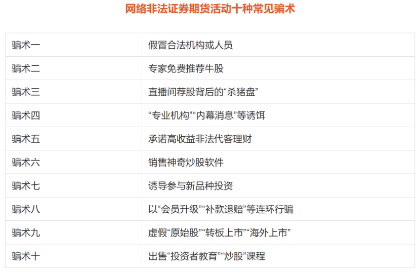 “提供內(nèi)幕信息”、“包賺不賠”、“保證上市”、“專家一對一貼身指導(dǎo)”、“對接私募”等說法吸引投資者。證券期貨投資是有風(fēng)險的,不可能穩(wěn)賺不賠。