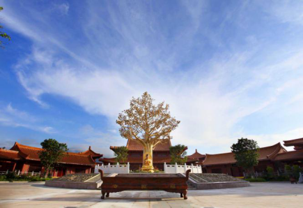 我們首先來到莊園里的福源寺。福源寺有全球首座戶外仿金銅鑄金菩提圣樹,樹高13.7米,4800片金葉子,運(yùn)用18噸仿金銅鑄造而成,取意釋迦牟尼菩提樹下悟道成佛典故。恰逢新年祈福法會,大家許下祈福求慧的美好心愿。