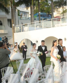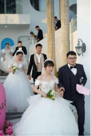 下午15點(diǎn),新人們完成妝造發(fā)型,來到婚禮現(xiàn)場(chǎng)。新郎們統(tǒng)一著筆挺西裝,紳士裝扮帥氣極了。新娘們將及腰長(zhǎng)發(fā)挽起,戴上珍珠鉆石點(diǎn)綴的皇冠,薄紗披在萬千青絲上?;榧喌目钍礁鞑幌嗤?,有胸前鑲嵌鉆石,后背鏤空設(shè)計(jì)的魚尾婚紗,完美地展示身材曲線;也有綢緞面料寬大裙擺的一字肩婚紗,搭配著小禮帽頭紗,充滿了法式風(fēng)情;更多的是蓬蓬型婚紗,上身裁剪合體收腰,下身蓬起的寬大蕾絲裙擺,層層疊疊輕紗彌漫,或綴滿軟緞織就的玫瑰,或?qū)毷磋傞W閃發(fā)光,讓新娘如同高貴的公主,優(yōu)雅而華麗。
