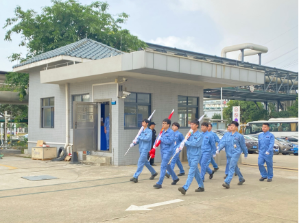 7點(diǎn)35分,參加升旗儀式的員工統(tǒng)一著工裝,面向升旗臺集合列隊(duì)。隨后,旗手和護(hù)旗手踏著雄壯有力的步伐護(hù)送國旗就位。伴隨著國歌響起,全場員工莊嚴(yán)肅穆地面向國旗行注目禮。