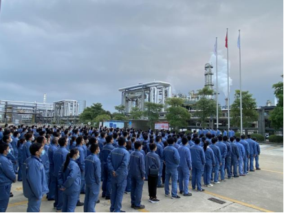 7點35分,全體員工在宇新化工辦公樓前坪列隊集合。7點40分,譚書記宣布升旗儀式正式開始,旗手們著裝統(tǒng)一,戴白手套,邁著鏗鏘有力的步伐,護著五星紅旗入場。伴著雄壯的《義勇軍進行曲》響起,國旗冉冉升起,全體員工行注目禮,莊嚴肅穆。