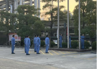 7點(diǎn)35分,全體員工在宇新化工辦公樓前坪列隊(duì)集合。7點(diǎn)40分,王總宣布升旗儀式正式開始,旗手們精神飽滿,邁著整齊劃一、鏗鏘有力的步伐,護(hù)著五星紅旗入場。伴著雄壯的《義勇軍進(jìn)行曲》響起,國旗冉冉升起,全體員工行注目禮,莊嚴(yán)肅穆。